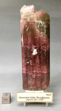 Коллекция Систематическая коллекция, №86662. Столбчатый кристалл (13х4 см), образованный комбинацией тригонал. призм, созд. грубуя комб. штриховку на гранях. С одного конца завершен пинакоидом, а сдругого парал. агр. шестоватых xls регенерир. скол? Вблизи торцов перпенд. удлин. зоны зелен. окраски. Содержит вростки xls альбита. 12.5х4