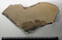 Коллекция Систематическая коллекция, №86678. Массивный тонкозернистый агрегат выполняющий трещины в брекчированном глинистом сланце. Плоский срез, покрыт с одной стороны эпоксидной смолой. Размер 17х10 см. Длина экспоната 17.0 см.
