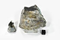 Коллекция Систематическая коллекция, №86700. Светло-голубые кристаллические корочки по трещинам в темноцветной породе. 7х6 см.