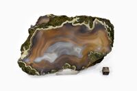 Коллекция Систематическая коллекция, №86814. Халц. агат серо-белый зонально-концентрический с каналом (зап. агатом) вдоль центральной части и базальтом по периферии, на кот. нарастает тонкосферолитовая корка (до 4-5 мм) кальцита с пиритом. Припол. пласт. вырез. из караваеподобн. миндалины с неровной поверхностью. 17.5х10х1 см.