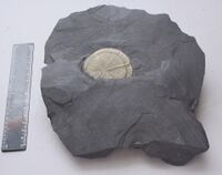 Коллекция Систематическая коллекция, №87080. "Пиритовый доллар". Сильно уплощенная радиальная концентрически-зональная округлая 6 см в поперечнике конкреция в плотном черном углистом сланце. Размер образца 25х20х3см. Длина экспоната 25.0 см.Размер минерала 6.00 см.