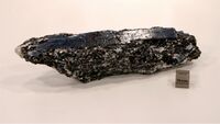Коллекция Систематическая коллекция, №87207. Светло-синий досчатый кристалл 14.5х1.5 см в плагиоклаз-биотитовом гнейсе.