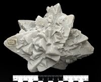 Коллекция Систематическая коллекция, №8723. Сросток серых за счет захваченных при росте включений частиц песчаника ромбоэдрических кристаллов кальцита размером более 6см. Длина экспоната 16.0 см.
