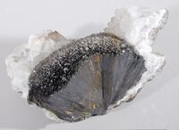 Коллекция Систематическая коллекция, №87244. Полусферолит радиусом около 8см, с кварцем. На фрагменте стенки миндалины в базальте. Размер образца 20х15х12см. Длина экспоната 20 см.