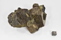 Коллекция Систематическая коллекция, №87301. Сросток уплощенных пинакоидальных кристаллов до 7х2.5 см. С пиритом, халькопиритом и сфалеритом. Длина экспоната 11.0 см.