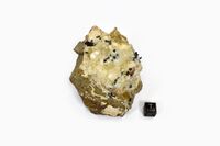 Коллекция Систематическая коллекция, №87333. Изометричные кр-лы акантита 2-6 мм. и копьевидные сростки сереб ра среди кальцитовых кр-лов на метасоматически измененном диа базе. Длина экспоната 8.5 см.