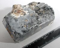 Коллекция Систематическая коллекция, №87401. Пинакоидальный {010}+{100}+{001} кристалл- параллелепипед 15х4.5х4.5см. Длина экспоната 15.0 см.