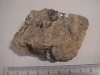 Коллекция Систематическая коллекция, №87426. В зональной оторочке замещения в срастании с жозеитом В (снаружи мелкозернистой, внутри среднезернистой), вокруг прерывистых пластинок цумоита до 7х25 мм в плоскости неясных кпш-кварцевых тонких прожилков в окварцованном риолите. Длина экспоната 7.0 см.