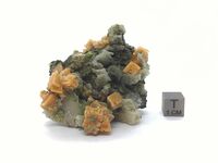 Коллекция Систематическая коллекция, №87591. Слабоскрученные кремового цвета ромбоэдрические кристаллы до 8мм и их сростки; с пластинами каль цита и с ломонтиом на скарниро- ванной породе с эпидотом, пири- и магнетитом. Длина экспоната 6.0 см.