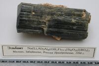 Коллекция Систематическая коллекция, №87639. Зональный от черного в ядре до зеленого по краям и синего у моноэдра 001 столбчатый кристалл {100}+{110}+{001} с клевеландитовым агркгатом. Длина экспоната 10 см.Размер минерала 10 см.