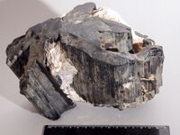 Коллекция Систематическая коллекция, №87647. Сросток двух черных (просвечивающих зеленым или коричневым цветом по краям) футляровидных скелетных кристаллов до 13см со светлыми зонами в центральных частях и с врастаниями мусковит-клевеландитового агрегата в трубчатых углублениях и входящих углах призматического пояса. Отдельные зоны имеют лиддикоатитовый состав. Размер образца 20х12х12см. Длина экспоната 20 см.