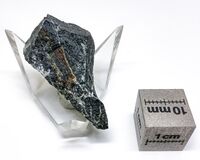 Коллекция Систематическая коллекция, №87694. Массивный серочерный мелкозернистый агрегат, рассеченный тонкими прожилками кварца. Длина экспоната 4.0 см.