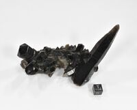 Коллекция Систематическая коллекция, №87729. Друза черных кристаллов с наиболее крупным- обелисковидным кристаллом длиной 9см. Длина экспоната 11.0 см.
