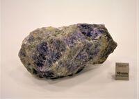 Коллекция Систематическая коллекция, №87750. Уплощенное зерно 9х7х4 см, замещенное вдоль трещин спайности по (001) зеленоватой слюдкой, в кварц- кордиерит-биотитовом сланце. Длина экспоната 9.0 см.