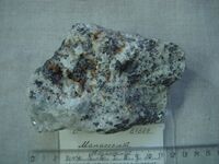 Коллекция Систематическая коллекция, №87829. Коричневато-желтые до 2.5 мм. призматически-дипирамидальные кристаллы в пустотках карбонатита с магнетитом. Длина экспоната 12.5 см.