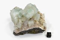 Коллекция Систематическая коллекция, №87908. Бледно-зеленоватые кубовидные кристаллы до 4 см (100)+(001)+слабо развитые грани (111) и сростки меньшего размера уплощенных по (001) кристаллов со стильбитом на базальте. Фрагмент минерализованной миндалины. Длина экспоната 9.5 см.