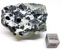 Коллекция Систематическая коллекция, №87951. Черные призматические кр-лы до 1 см. в кальцит-апатитовом гнез- де в мелкозернистом диопсиде. Состав по данным зондового ана лиза: Naё.ЎCa(MgЇ.є,AlЁ.є,FeЁ.є)Ї.• [Alё.ўSiЎ.єOЄЄ](OH)Є Длина экспоната 6.0 см.