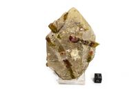 Коллекция Систематическая коллекция, №88005. Поперечнозональные от красного до зеленого длинностолбчатые до 5.3х1 см. дитригонально призматические кристаллы, с головками ограненными пирамидой {201} и фрагменты кристаллов на гранях уплощенного корродированного кристалла кварца 11х7х3.5 см. Длина экспоната 11.0 см.