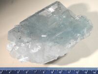 Коллекция Систематическая коллекция, №88012. Фрагмент 10х6х2 см.(вероятно часть ограненной дипирамидами hkl вершины и часть призматического пояса граней hk0) бледно-голубого кристалла с вросшими вблизи его поверхности молочно-белыми длиннопризматическими, завершенными с обоих вершин кристаллами кварца до 1.5х0.3 см. и бесцветными кристаллами датолита от 0.05 до 1.3 см. Длина экспоната 10 см.