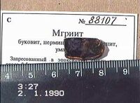 Найден: Schlema, Erzgebirge, Саксония, Германия.Минералы-спутники: Буковит, Перминжатит, Эскеборнит, Умангит. Расположен на витрине exp74-1