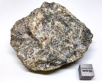 Коллекция Систематическая коллекция, №88268. Массивный темно-коричневый зернистый агрегат с тиродитом и турнеритом (ярко оранжевая флюоресценция в коротком УФ). Длина экспоната 10 см.