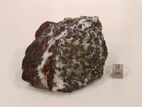 Коллекция Систематическая коллекция, №88325. Темнокрасный крупнокристаллический агрегат в кальците с черными кристаллами и зернами франклинита и зеленоватым виллемитом. Длина экспоната 12.0 см.