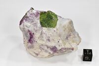 Коллекция Систематическая коллекция, №88405. Хромистый. Яркий травяно-зеленый таблитчатый кристалл 2х2х0.4 см в кальците с белым чешуйчатым хлоритом и кочубеитом. Длина экспоната 6.5 см.