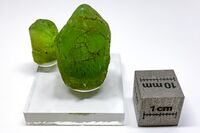 Коллекция Систематическая коллекция, №88432. Яркозеленый прозрачный пинакоидально-призматический кристалл с фигурами роста-растворения на гранях. Длина экспоната 1.0 см.