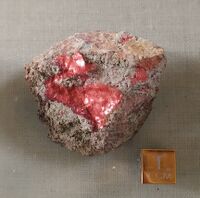 Коллекция Систематическая коллекция, №88436. Ярко красные листоватые выделения, сложенные тонкоигольчатыми кристаллами на окисленной породе. Длина экспоната 4.0 см.