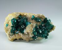 Коллекция Систематическая коллекция, №88447. Друза призматических кристаллов (110)+(101) с кальцитом в полости в известняке. Длина экспоната 10 см.