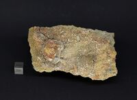 Коллекция Систематическая коллекция, №88543. Мелкие 0.n мм жетоватозеленые блестящие кристаллы на обожженном растрескавшемся гравелите. Длина экспоната 12.0 см.