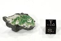 Коллекция Систематическая коллекция, №88563. Яркозеленые щетки таблитчатых кристаллов ограненных тетрагональной призмой и пинакоидом в прожилке в кварц- пиритовом агрегате. Длина экспоната 3.0 см.