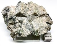 Коллекция Систематическая коллекция, №88638. Сросток зеленовато-серых короткостолбчатых кристаллов {110}+{001} до 2.5 см с коркой кремового цвета. Эгирин, астрофиллит. Размер 7.5 х 3.5 см. Длина экспоната 7.5 см.