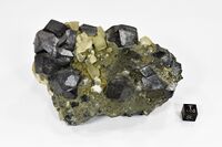 Коллекция Систематическая коллекция, №88674. Друза ромбододекаэдрических кристаллов до 2.5см с кальцитом на скарне. Длина экспоната 11.5 см.