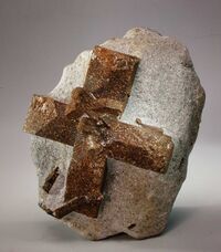 Коллекция Систематическая коллекция, №88824. Крупный ?8 см% двойник в виде прямого креста с приросшими более мелкими кристаллами в мусковитовом сланце. Длина экспоната 11.0 см.Размер минерала 8.00 см.