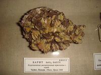 Коллекция Систематическая коллекция, №88832. Коричневые расщепленные кристалы с серой Длина экспоната 11.0 см.