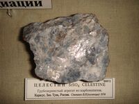 Коллекция Систематическая коллекция, №88872. Грубозернистый темно-голубой с бастнезитом?, стронцианитом и Ce-магнетитом. Длина экспоната 7.0 см.
