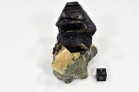 Коллекция Систематическая коллекция, №88885. Буро-черный 5см кристалл в кальцит-диопсидовом агрегате, скаполит. Длина экспоната 9.0 см.