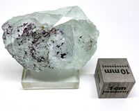 Коллекция Систематическая коллекция, №88906. Присыпки мелких красноватокоричневых чешуек на бледнозеленоватом с сиреневыми участками флюорите. Длина экспоната 4.0 см.Размер минерала 0.10 см.