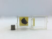 Коллекция Систематическая коллекция, №88920. Бесцветные гексагональнопризматические прозрачные кристаллы до 0.2мм в миндалине ороговикованной эффузивной породы. Длина экспоната 2.0 см.Размер минерала 0.02 см.