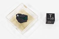 Коллекция Систематическая коллекция, №88921. Яркозеленые сферолитовые сростки до 0.5мм, инкрустирующие пустотку . Бледнозеленые сростки тонких пластинок на рамсбеките - вероятно шуленбергит. Длина экспоната 1.5 см.Размер минерала 0.10 см.