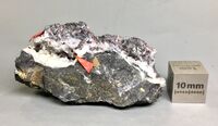 Коллекция Систематическая коллекция, №88950. Темно-вишневые сдвойникованные кристаллы 2-3мм ,покрытые корочкой киновари на кварце с антимонитом в галхаит-антимонит-кварцевом прожилке. Длина экспоната 5.5 см.