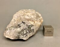 Коллекция Систематическая коллекция, №88953. Два гнезда до 3см стально-серого цвета с металлическим блеском в сером сливном кварце в срастании с линдстремитом. Длина экспоната 7.0 см.