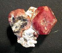 Коллекция Систематическая коллекция, №88954. Сросток нескольких кристаллов (наиболее крупный -1.5см) зонального гроссуляра. Внутренняя зона - зеленая, внешняя - ярко розовая. Длина экспоната 3.0 см.Размер минерала 1.50 см.