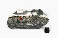 Коллекция Систематическая коллекция, №88989. Коричневые призмы до 8мм в жилке натролита и зеленого эгирина. Длина экспоната 10.5 см.Размер минерала 0.80 см.