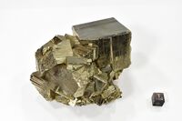 Коллекция Систематическая коллекция, №89035. Кристалл {100} по ребру 4,5см со штриховкой {210} на друзе меньших. Длина экспоната 9.5 см.Размер минерала 4.50 см.