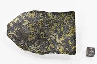 Коллекция Систематическая коллекция, №89045. Богатая лапчатая вкрапленность сульфидов в норите (преобладает халькопирит). Длина экспоната 10 см.