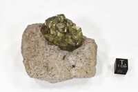 Коллекция Систематическая коллекция, №89048. Округлая конкреция (3,5см) в кварцевом порфире, образованная с поверхности блочными кристаллами {100}+{111}. Длина экспоната 6.0 см.