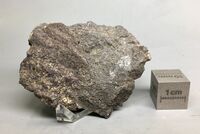 Коллекция Систематическая коллекция, №89105. Красновато-коричневые изометричные зерна вкраплены в измсененном вулканите (дацит?). Больше на гранат похоже. Длина экспоната 5.0 см.