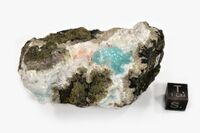 Коллекция Систематическая коллекция, №89203. Ярко-голубые тетрагональные призмы до 0,7см на "кубических" кристаллах кальцита, морденит, сноповидный кварц из шаровых лав. Длина экспоната 7.0 см.